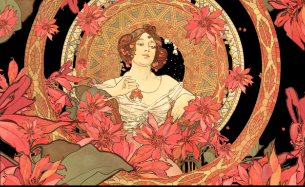 Alphonse Mucha (Czech Republic, 1860 - 1939) is internationally renowned for his posters and decorative illustrations. His work is instantly recognizable by the female figures with flowing hair, surrounded by stylized floral motifs and flowing lines, rendered in pastel colors.